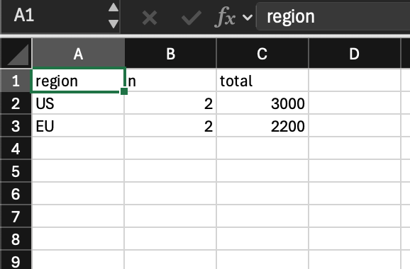 (excel:write-xlsx *clean* #p"~/Downloads/report.xlsx" :sheet "Summary")At this point you should have a report.xlsx you can open immediately. It contains exactly what the pipeline says: rows filtered by revenue >= 1000, aggregated by region, with total being the sum and n counting how many rows contributed — then ordered by total descending.