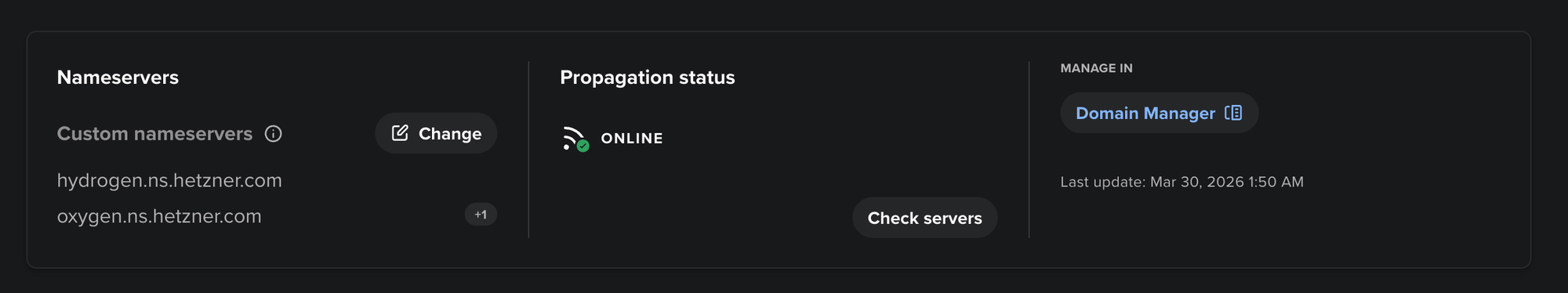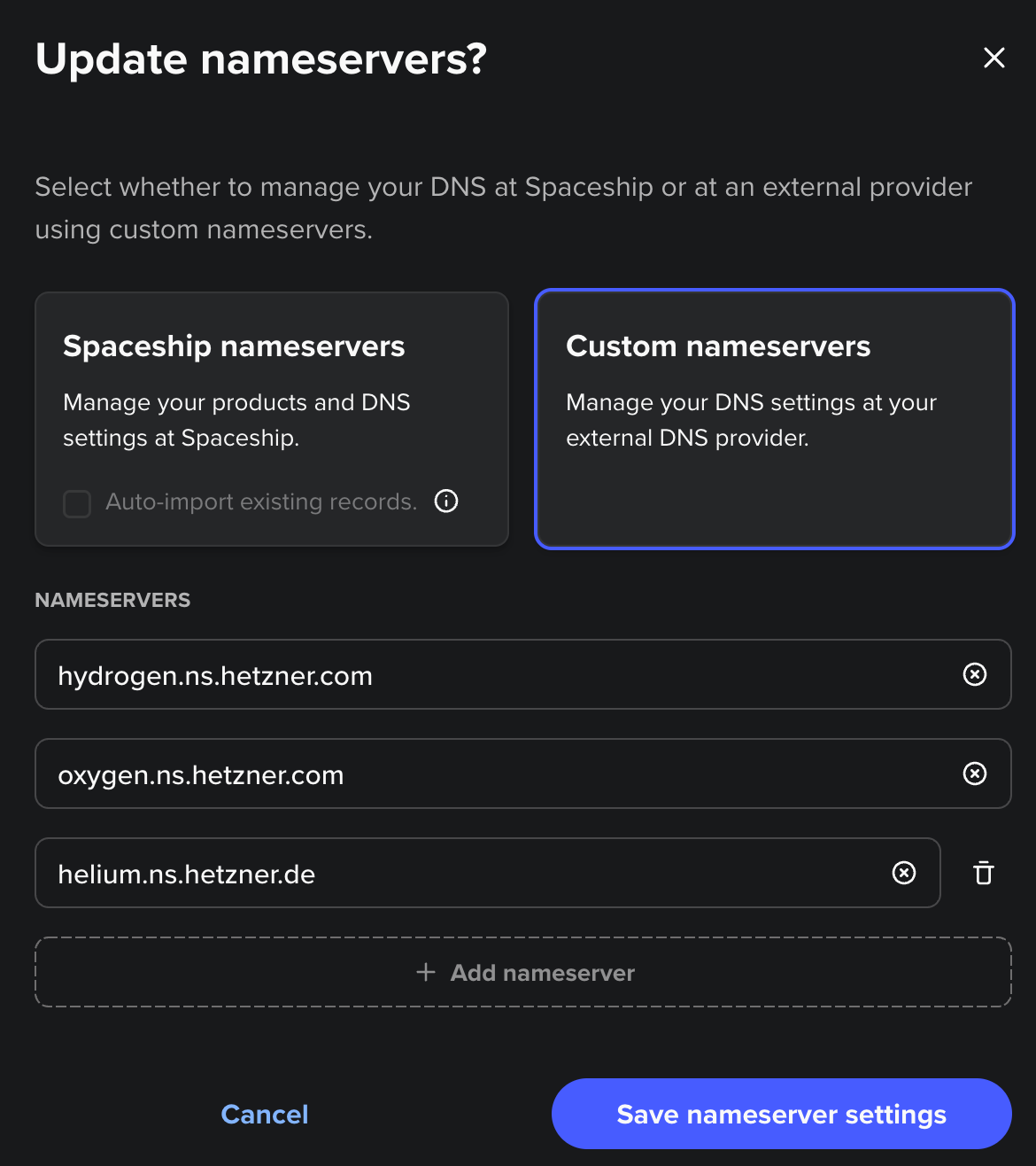 At your registrar (Spaceship), set custom nameservers to the three Hetzner ones (all three).